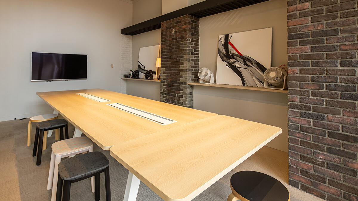 ミーティングルームでは、10名ほど収容できる広い部屋で壁面にある大型モニターなどを使って会議やセミナーを実施することができます。ミーティングルームには専用のTV会議会議システム「Logiccol Meetup」が利用可能です。